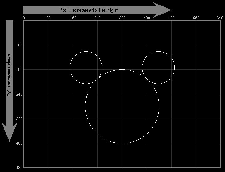 As you might have guessed, the second number controls the vertical position of the circle. We call this the "y" position, but note that larger "y" values move the circle down (not up). This is the reverse of the normal mathematical convention, but you can remember both the "x" and "y" conventions by remembering that they progress in the same direction as normal English writing. We write on a page from left to right ("x" direction) and from the top down ("y" direction). Both of these are summarized in the following diagram: